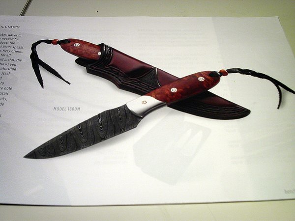 Thunderforge Damascus steel blade (3.75"), 7.45" overall, 3.75oz. Handle is stabilized Amboyna Burlwood w/ Stainless steel bolsters and Mosiac pins; Beaded/Leather Lanyard; Sheath: Custom, Hand Cut Leather, tooled and carved by Chris Kravitt. Numbered and comes in a presentation case with certificate of Authenticity. MSRP $800