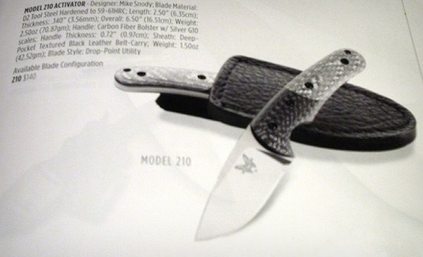 The 210 Activator is a fixed blade of S30V Stainless - 2.5" blade, 6.5" overall, 2.5oz. Handle is carbon fiber bolster with silver 620 scales. Sheath is deep pocket textured black leather set for belt carry.